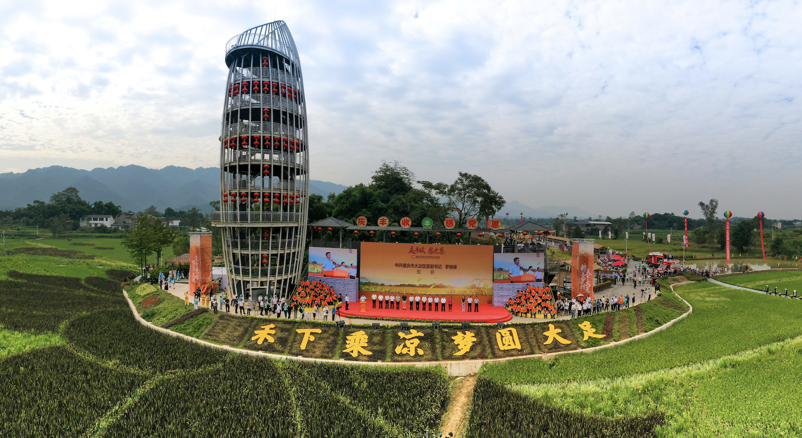 一粒米观景塔作为五彩田园景区中的标志性建筑,高达30米,外观为“米粒”状,是世界上最大的一粒“米”,与袁隆平院士“禾下乘凉·梦圆大足”的题词相呼应。游客拾级而上,水稻图案渐渐清晰,俯瞰景区全貌,将五彩斑斓的水稻图案尽收眼底,站在观景塔上领略“风吹稻穗千层浪,家乡处处粮满仓”的田园美景。