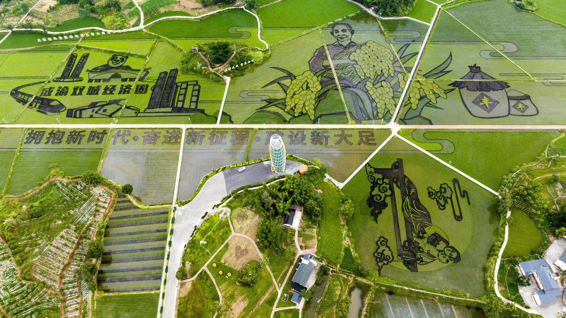 9月21日,当地稻农在稻田里舞龙迎接中国农民丰收节。 近日,重庆市大足区拾万镇长虹村隆平五彩田园丰收在即,巨型稻田画勾勒出金秋壮美景象,吸引众多游客前来打卡游玩。 新华社记者 唐奕 摄 9月21日,游客在重庆大足五彩田园的稻田里游玩。 近日,重庆市大足区拾…