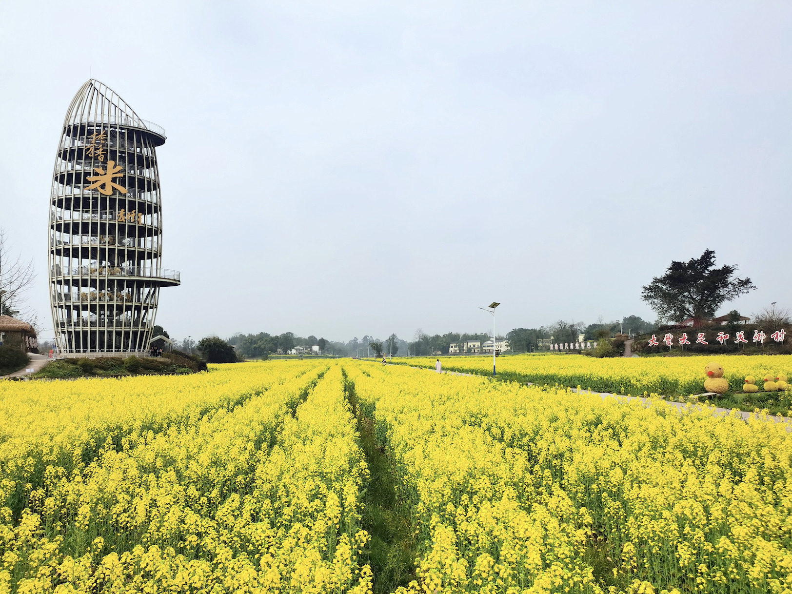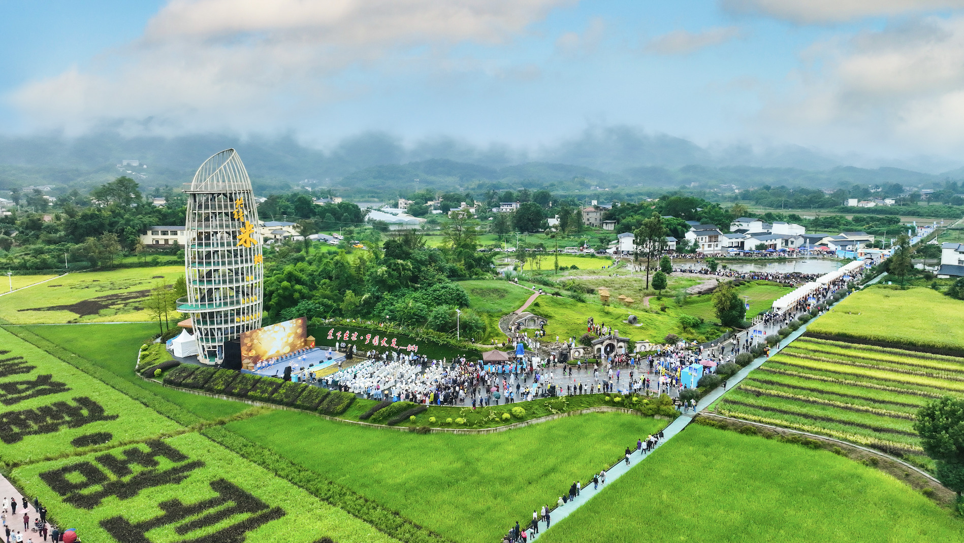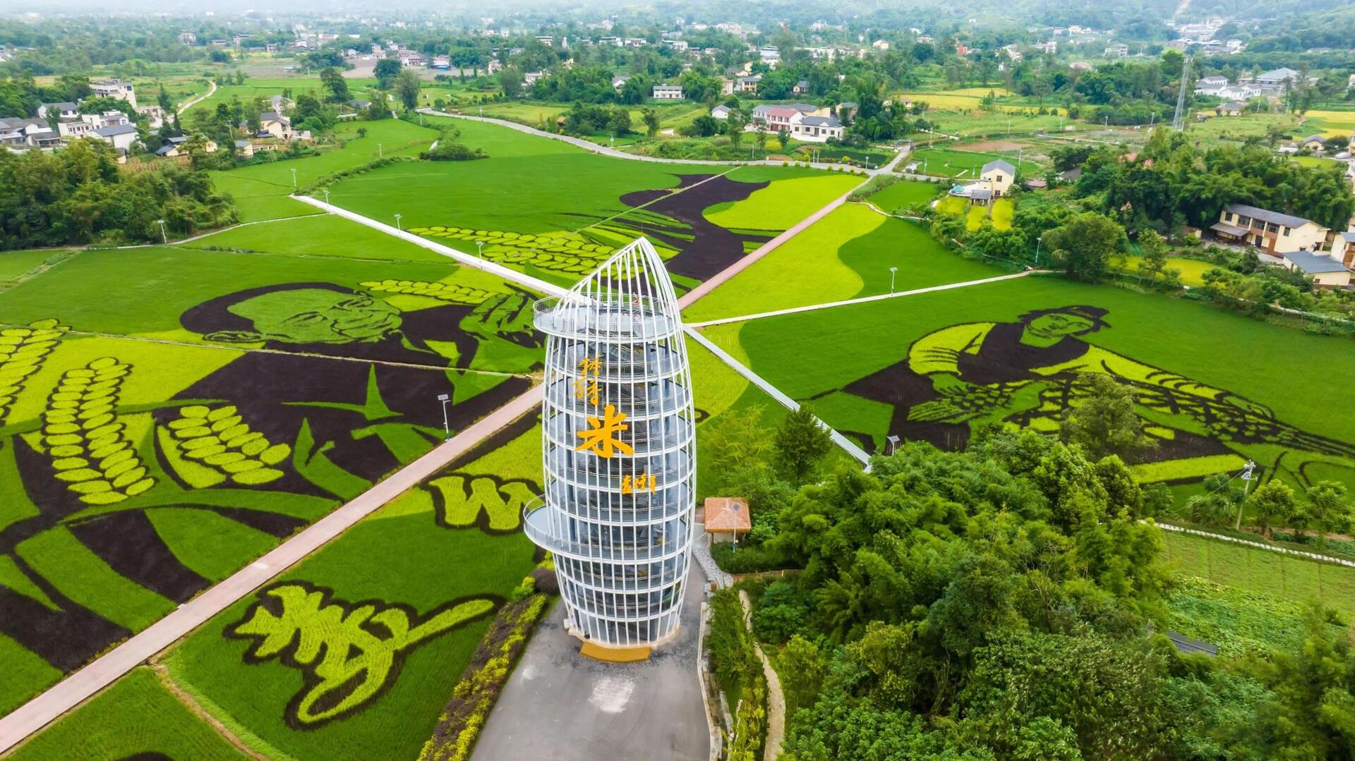 一粒米观景塔作为五彩田园景区中的标志性建筑,高达30米,外观为“米粒”状,是世界上最大的一粒“米”,与袁隆平院士“禾下乘凉·梦圆大足”的题词相呼应。游客拾级而上,水稻图案渐渐清晰,俯瞰景区全貌,将五彩斑斓的水稻图案尽收眼底,站在观景塔上领略“风吹稻穗千层浪,家乡处处粮满仓”的田园美景。