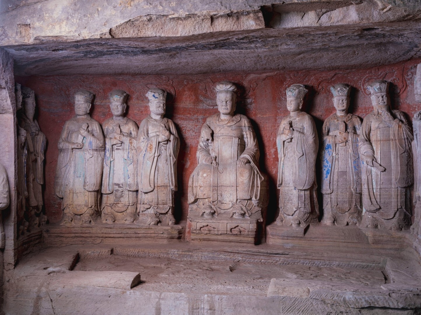 石门山石刻位于大足城区东南20公里的石马镇,开凿于北宋绍圣至南宋绍兴年间(1094—1162),清有少量增刻。造像布置于山顶东侧、西侧和南侧三个相对独立的岩体崖壁上,共编22号龛。此处为释、道合一造像区,尤以道教造像最具特色,故在淳熙九年(1182)邓柽书《石门洞碑》称:“像无定刻、或仙或释、或诸鬼神、千百变见、混为一区。”1999年12月1日被列入《世界遗产名录》。